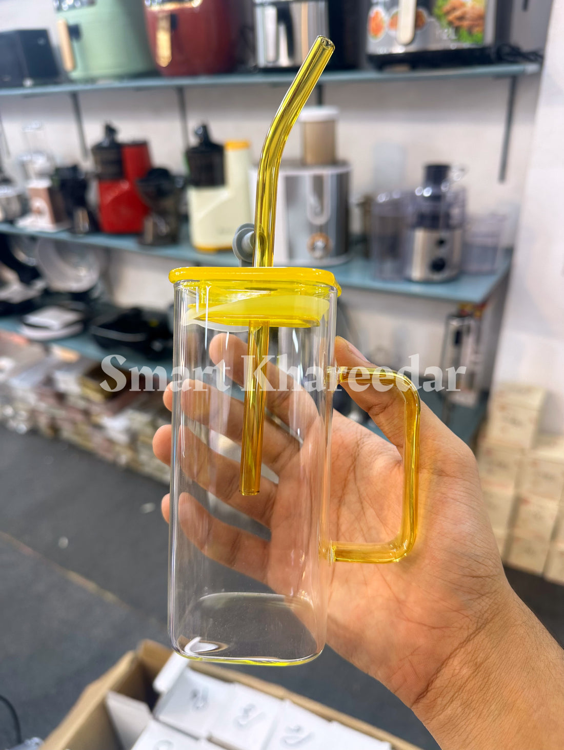 320ml Juice Glass with Glass Handle & Straw | Wooden Lid