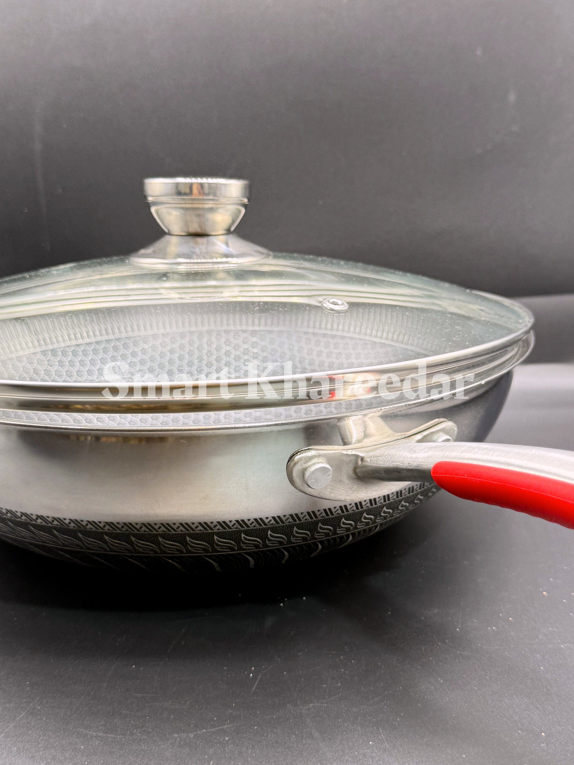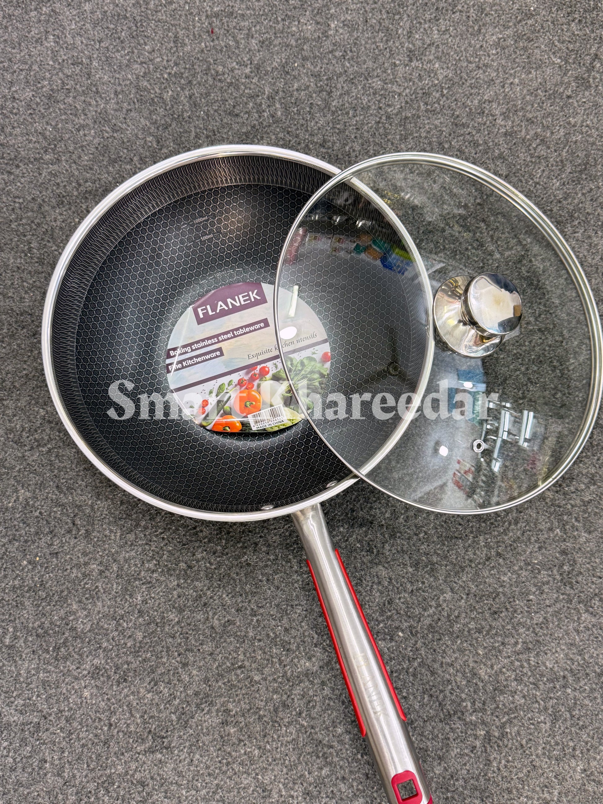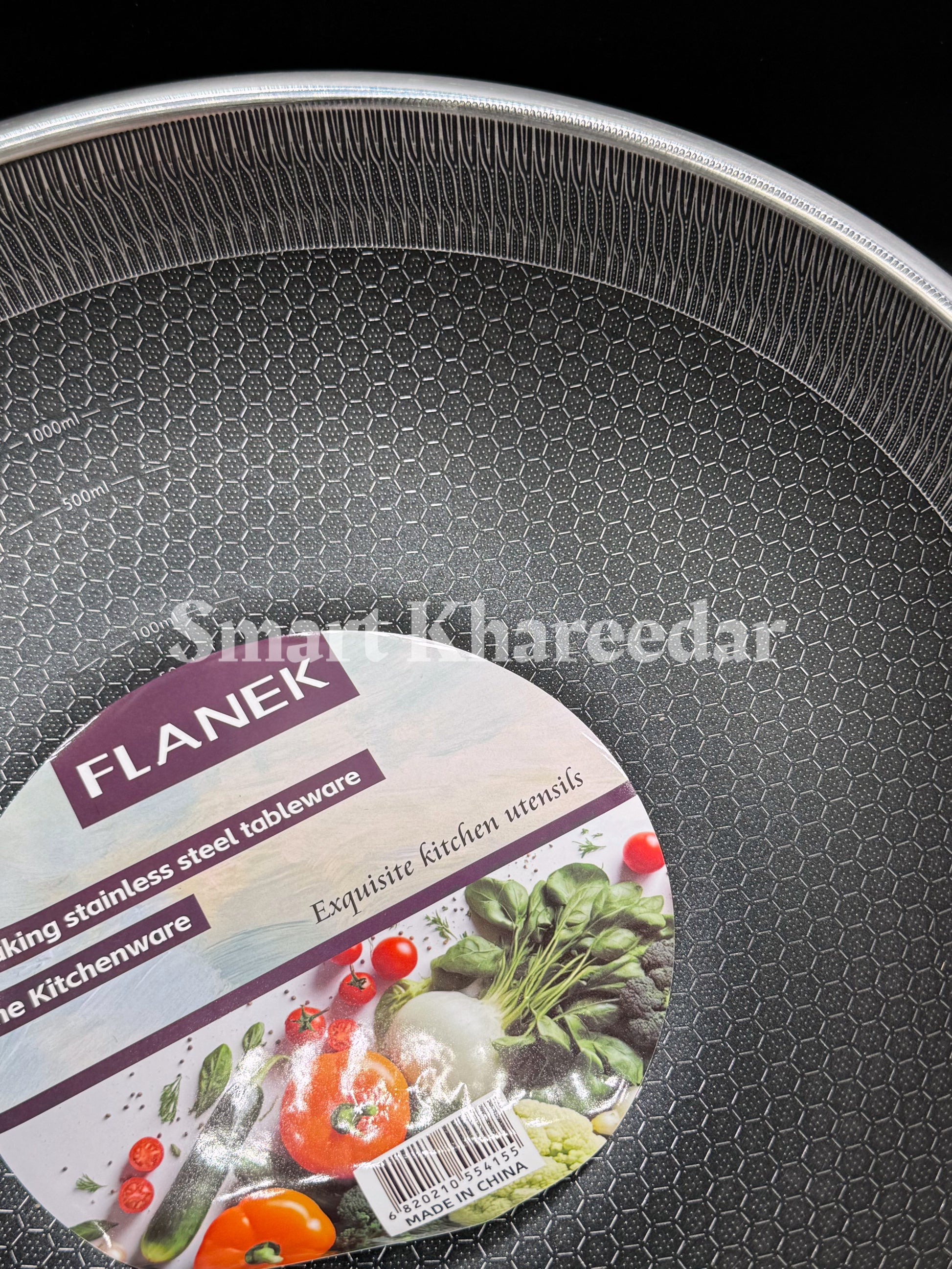 Flanek LaserCut HoneyComb Karahi with Lid and Long Handle - Shallow Pan