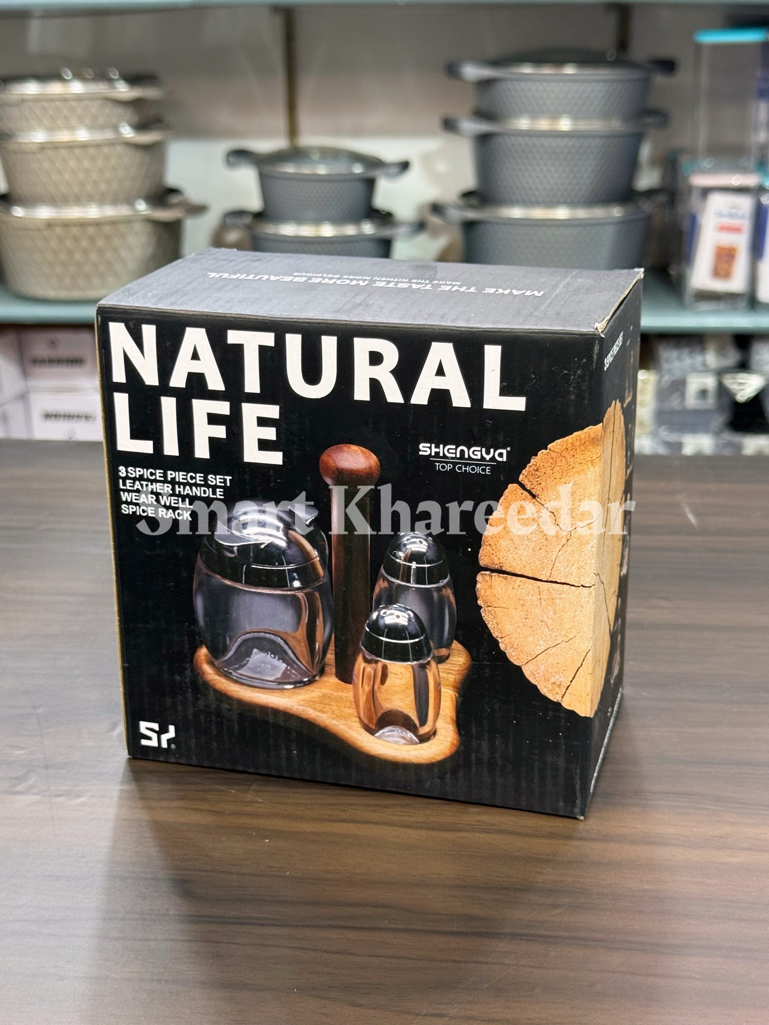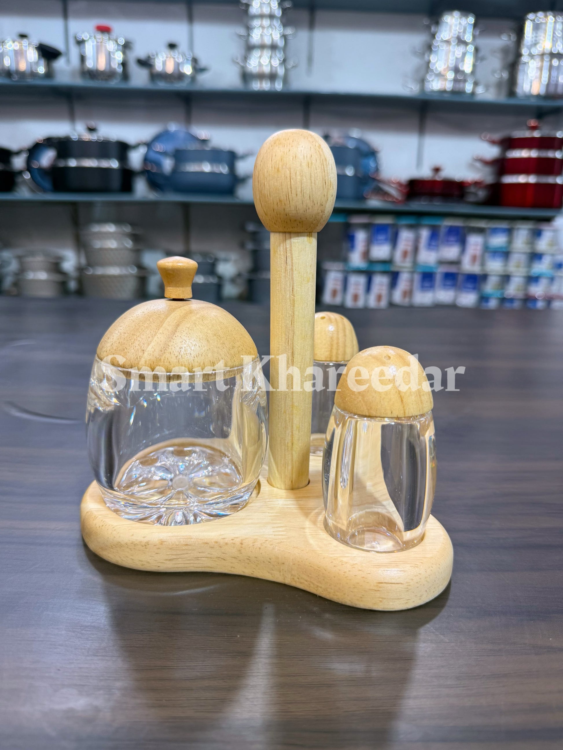 3pc Bamboo Wooden Cruet Set - 2 Salt & Pepper Shaker 1 Acrylic Sugar pot | Classic Table piece