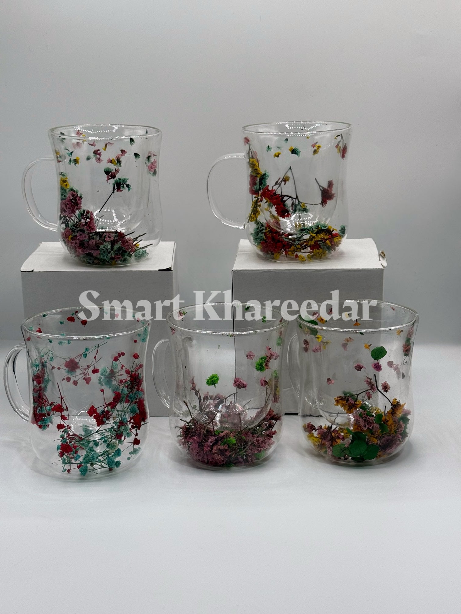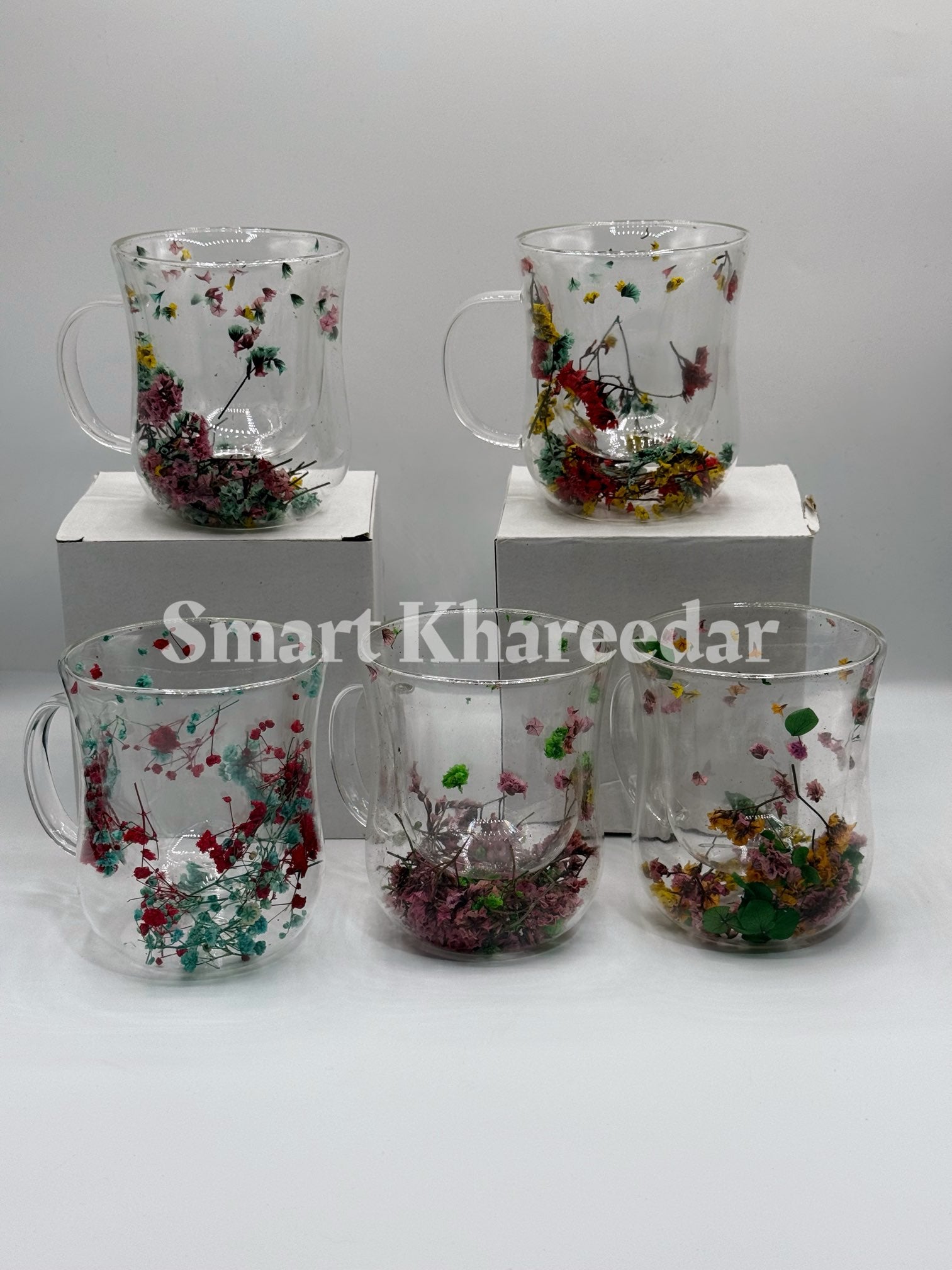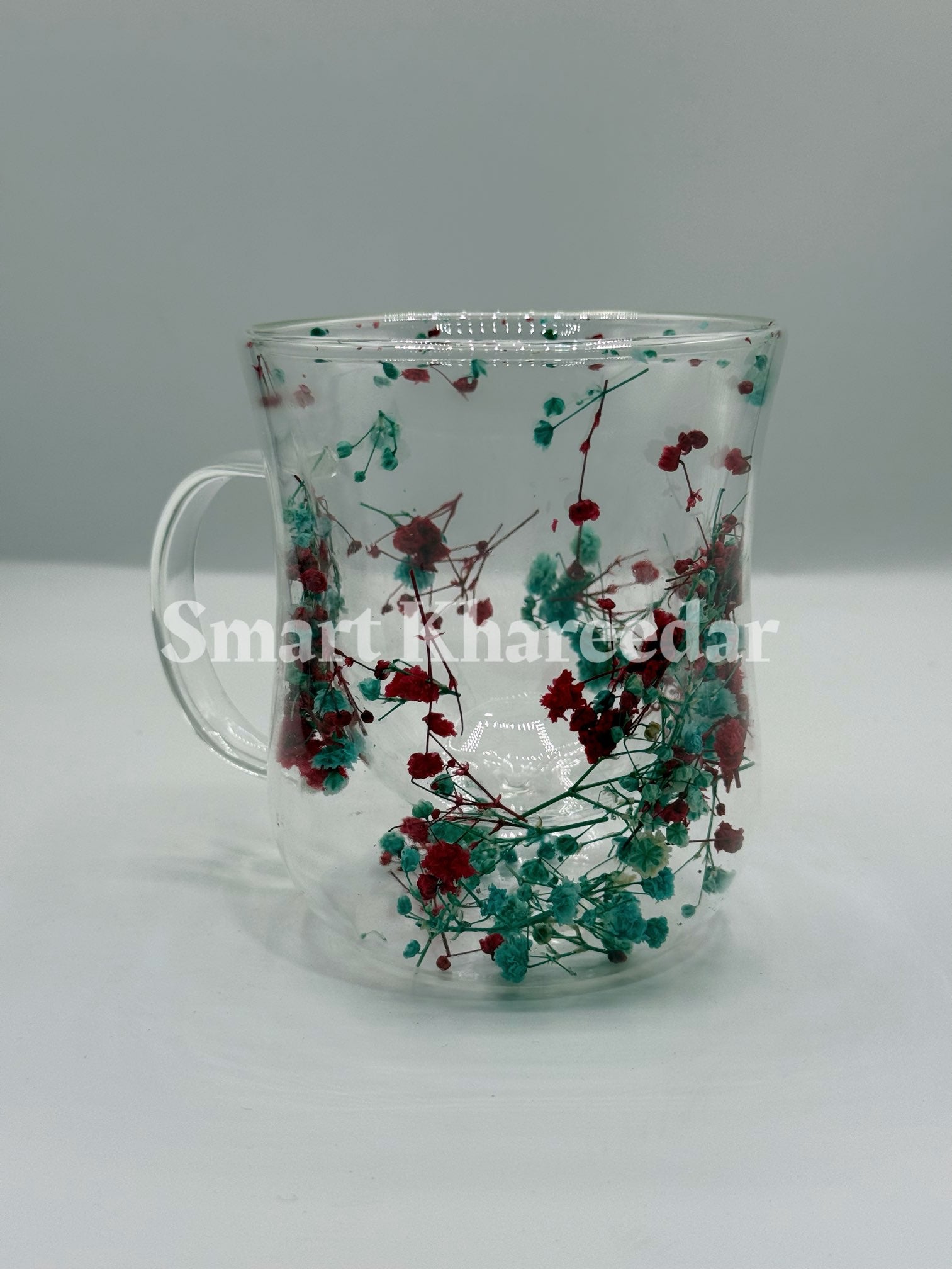 Double Wall Dry Flower 320ml Glass Coffee Mug and Tea Cup | Model no 5