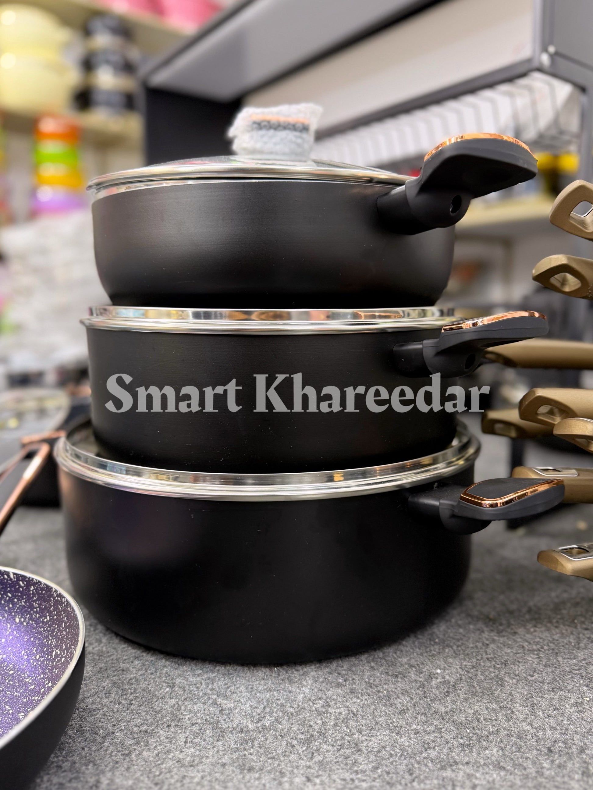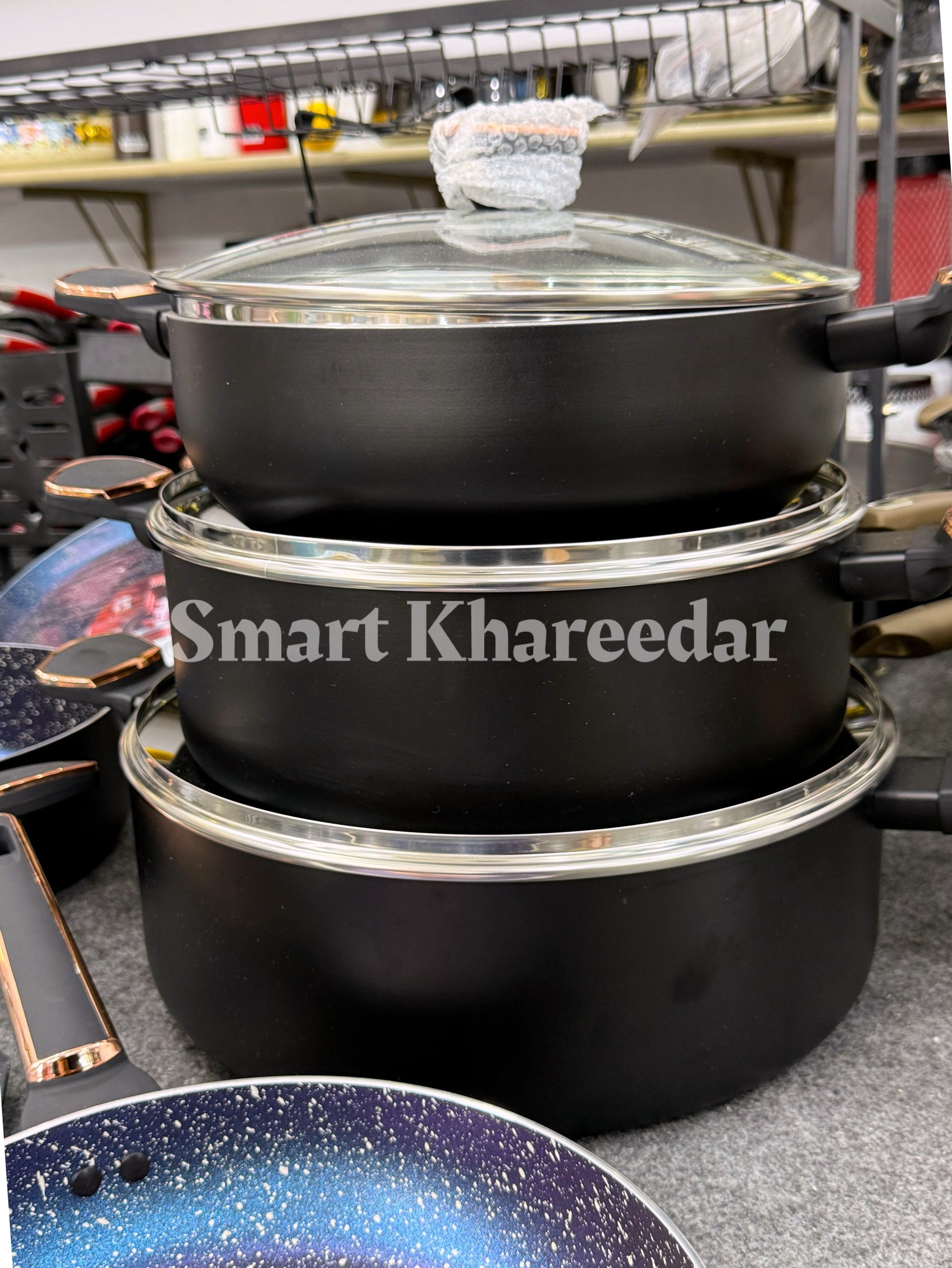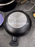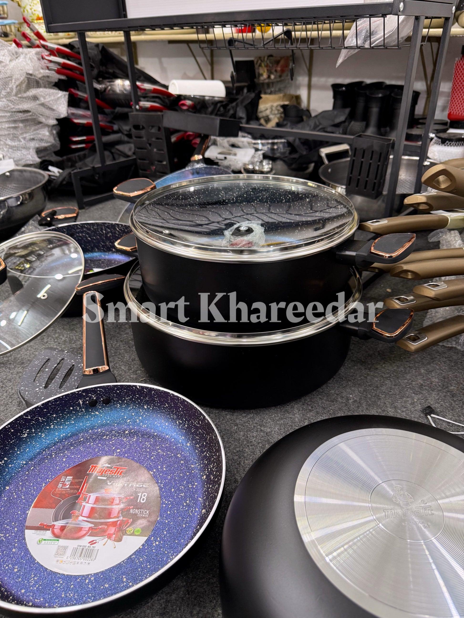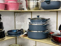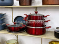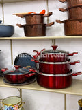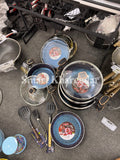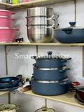 3 Cooking Pots Casserole (1st pot 28CM, 2nd pot 32CM, 3rd pot 36CM with heat tempered Glass Lid) 1 Pcs Wok 30CM with heat tempered Glass Lid, 1 pcs Frying Pan 28CM, 1 pcs Hot Plate 35CM, 6pcs kitchen tool, 1 pcs apron cover, 1 Pcs tong.