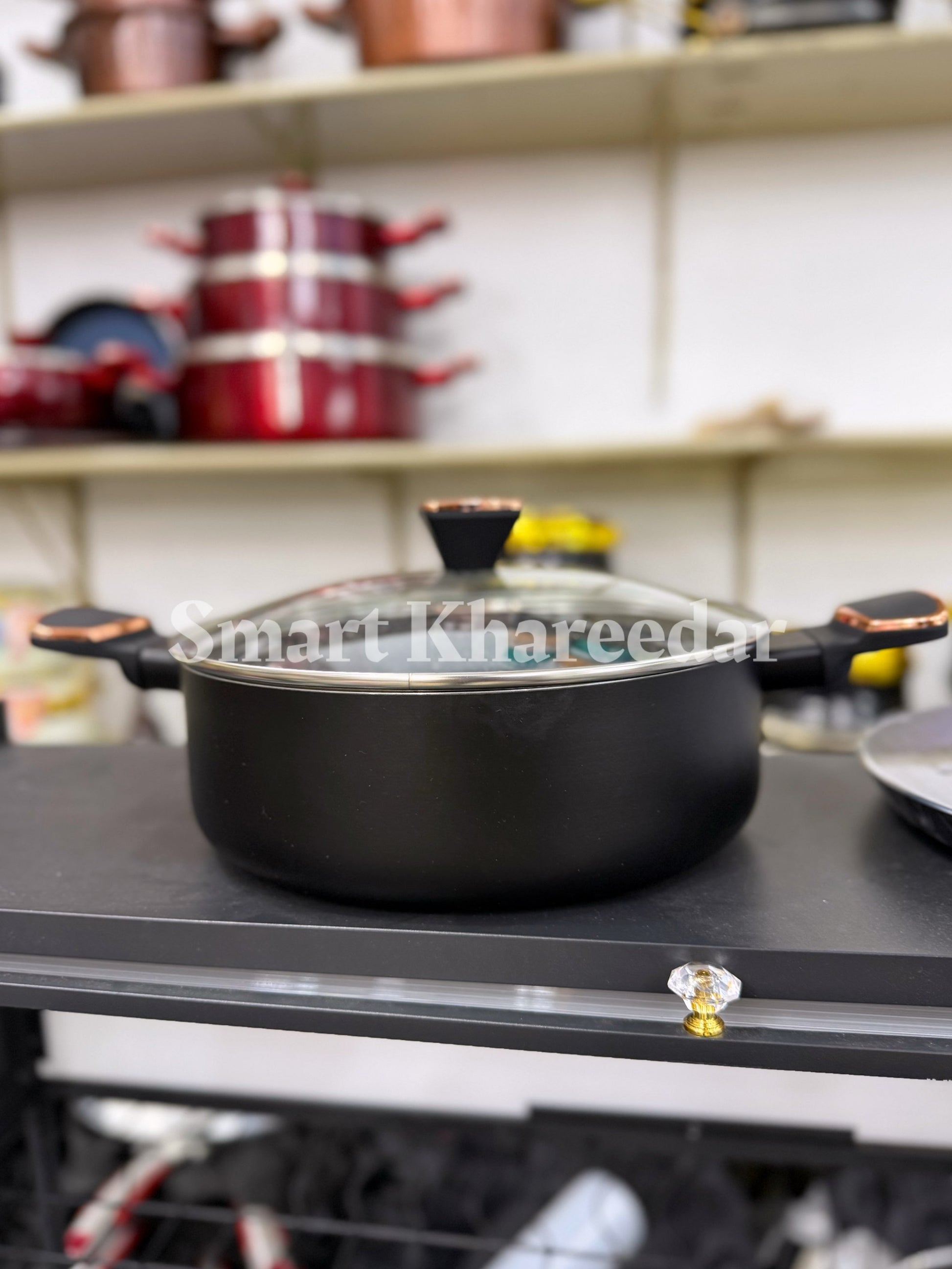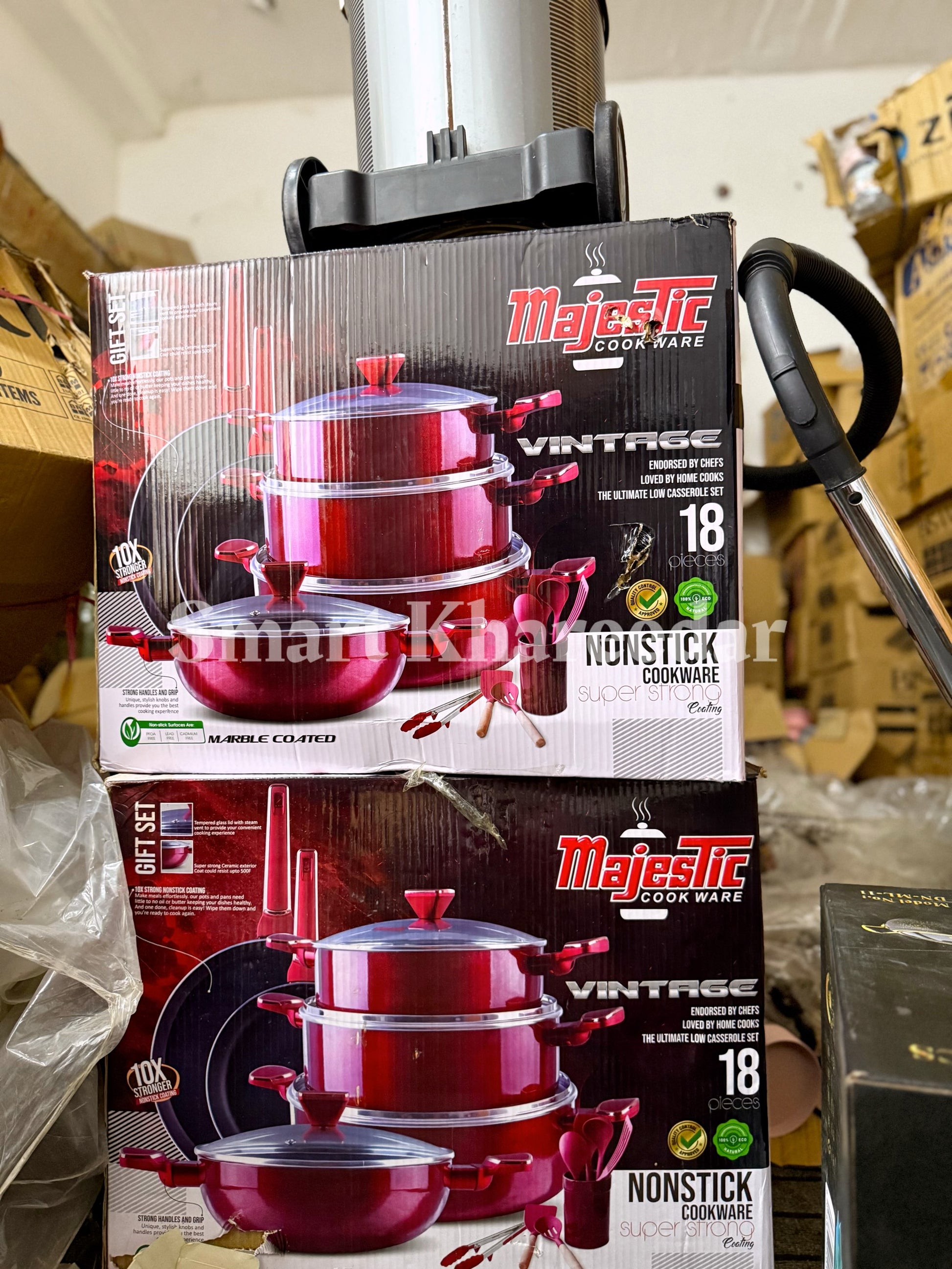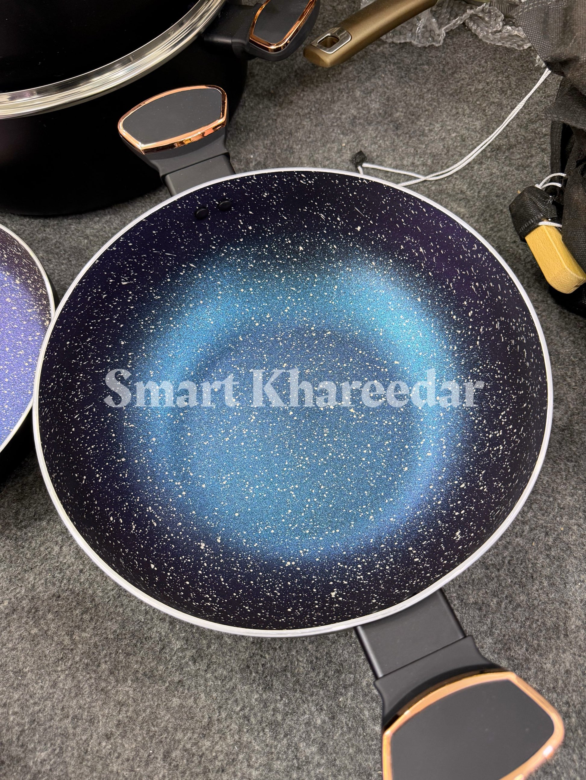 3 Cooking Pots Casserole (1st pot 28CM, 2nd pot 32CM, 3rd pot 36CM with heat tempered Glass Lid) 1 Pcs Wok 30CM with heat tempered Glass Lid, 1 pcs Frying Pan 28CM, 1 pcs Hot Plate 35CM, 6pcs kitchen tool, 1 pcs apron cover, 1 Pcs tong.